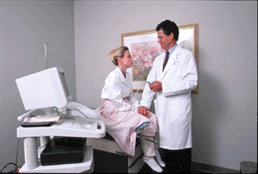 is seen here discussing the procedure with the patient before beginning the ultrasound examination.